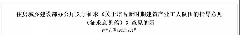 2017年11月,住建部印發(fā)關(guān)于《關(guān)于培育新時(shí)期建筑產(chǎn)業(yè)工人隊(duì)伍的指導(dǎo)意見(jiàn)(征求意見(jiàn)稿)》(建辦市函[2017]763號(hào))。
